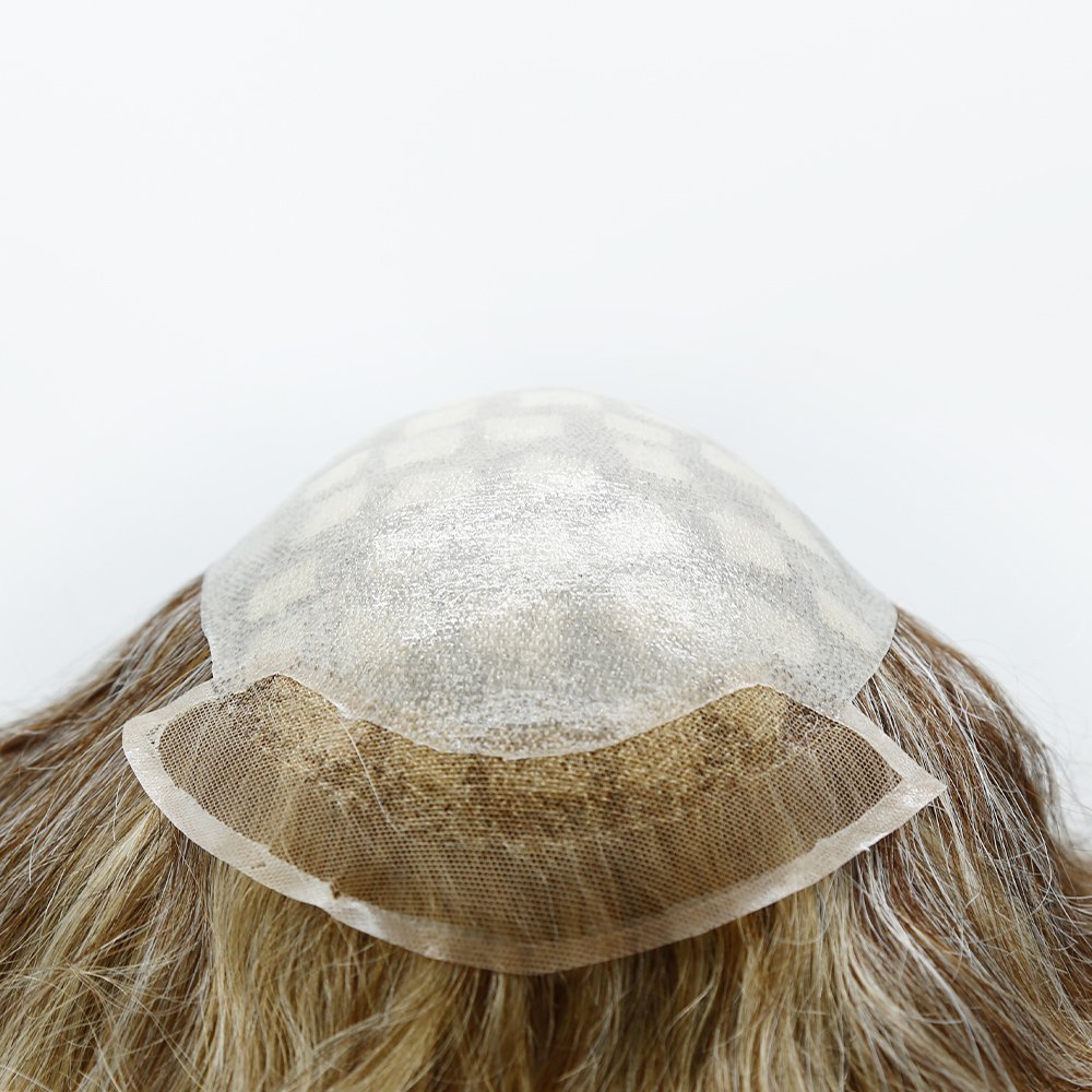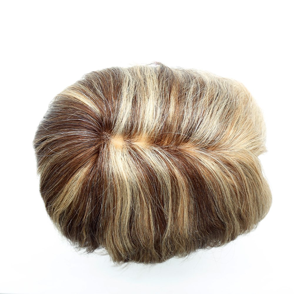 This toupee is Eminent Hair custom men’s toupee,it’s clear pu and lace front base. The clear pu edge can use tape or glue easily. The lace front can make natural hair line effect. Customers can choose to bleach the knot in front to make it invisible.