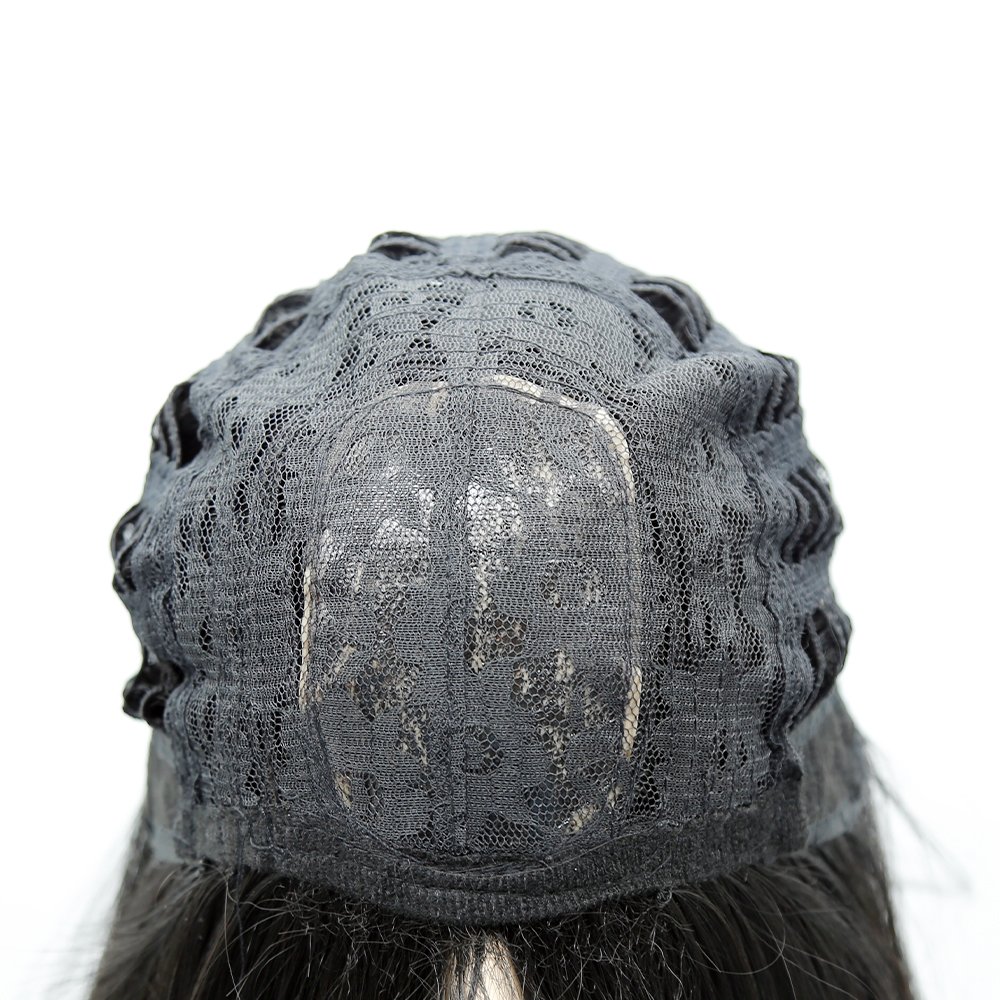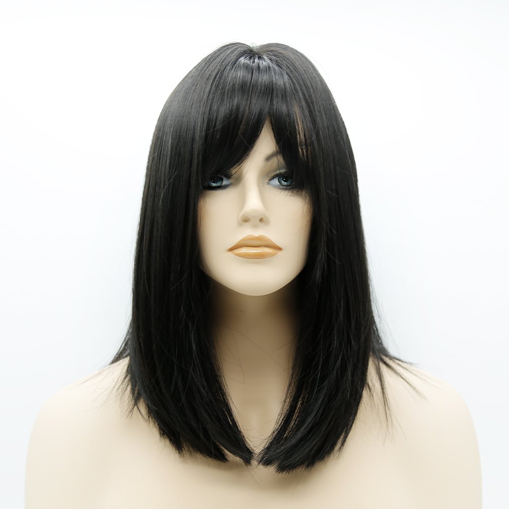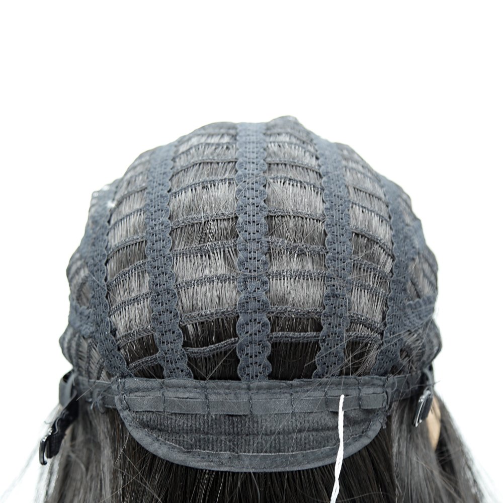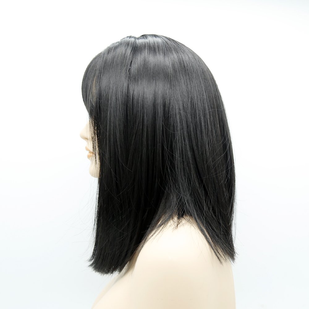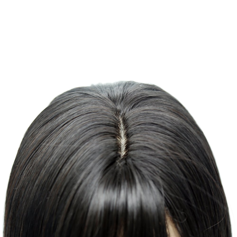 This is our synthetic wig. Hair length is shoulder-length with fringe. It has silk top, which is very natural. You can’t see the knots from the top. We put weft and S-shaped hook on the back. Then customers could adjust the size they want. The lifespan is about 6 monthes.